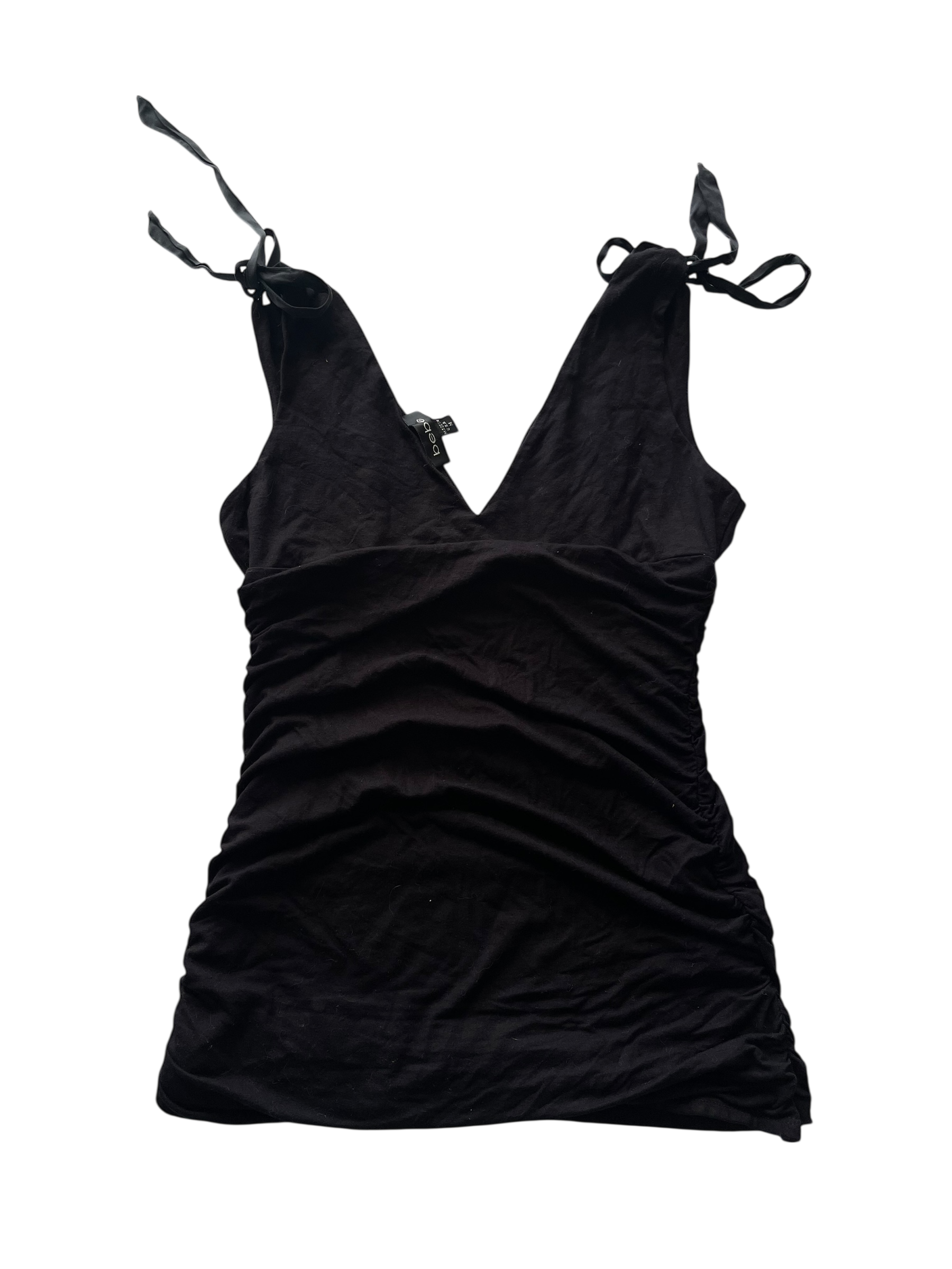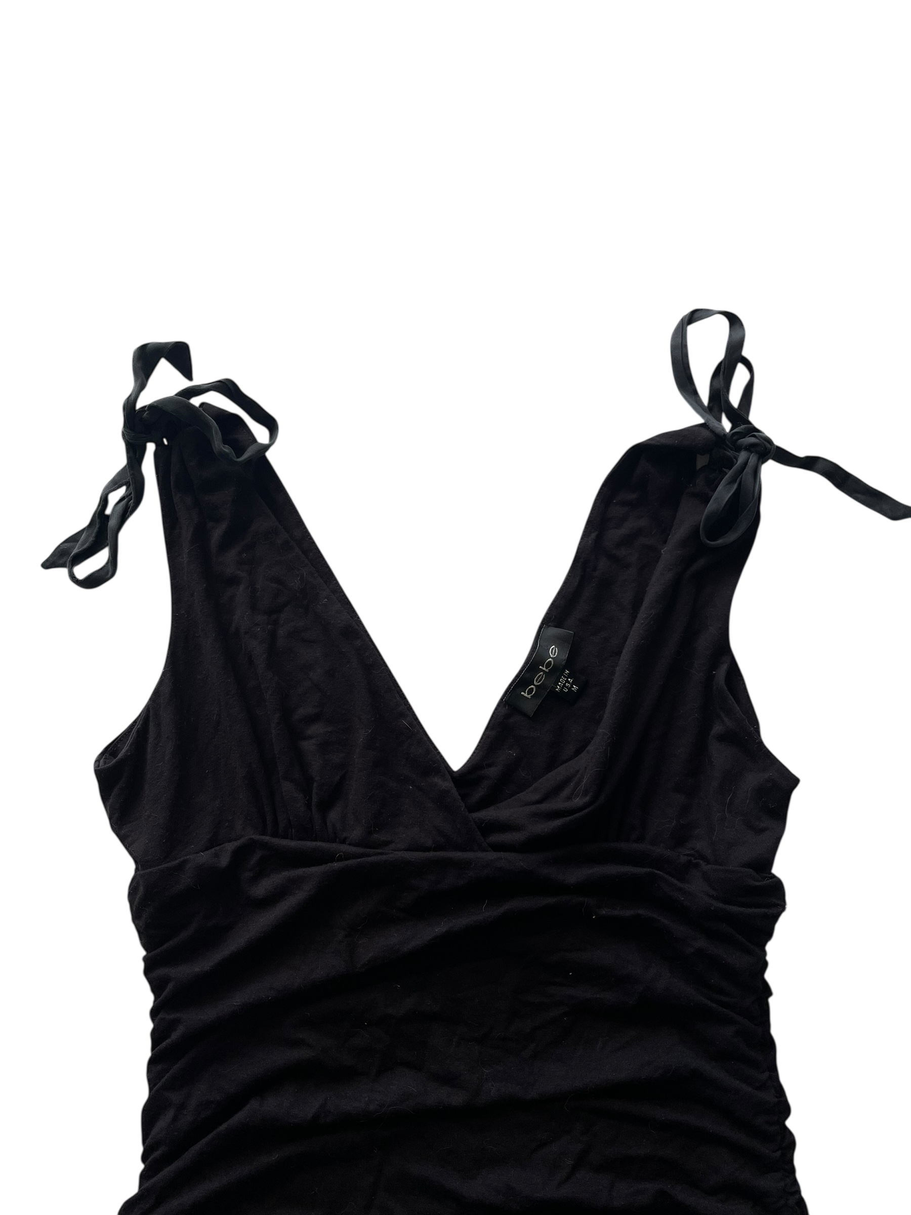 Soft stretch fabric with a ruched body and deep v-neckline. Features adjustable satin tie straps and a flattering gathered waist detail.