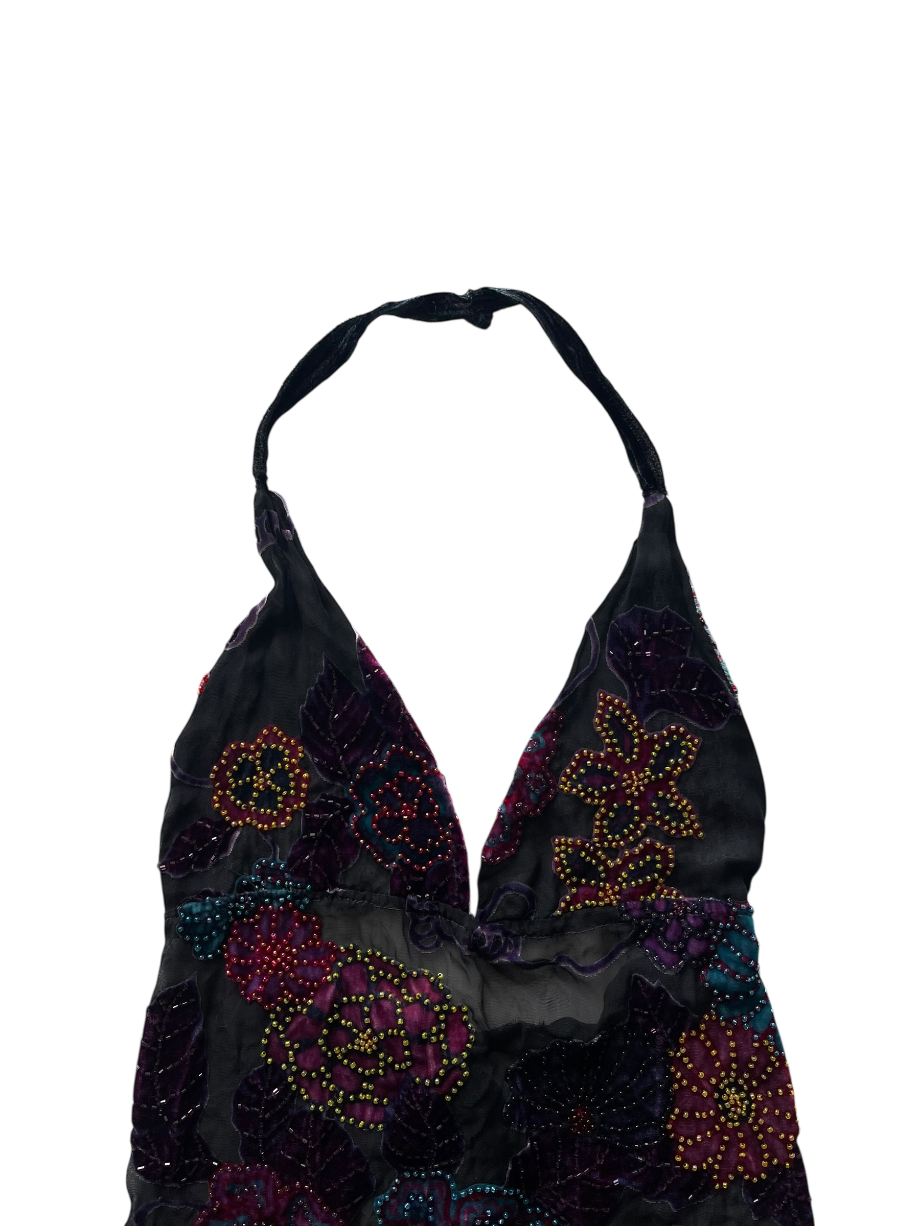 Sheer black mesh base detailed with velvet vibrant floral motif. features back tie and ideal for smaller bust sizes.