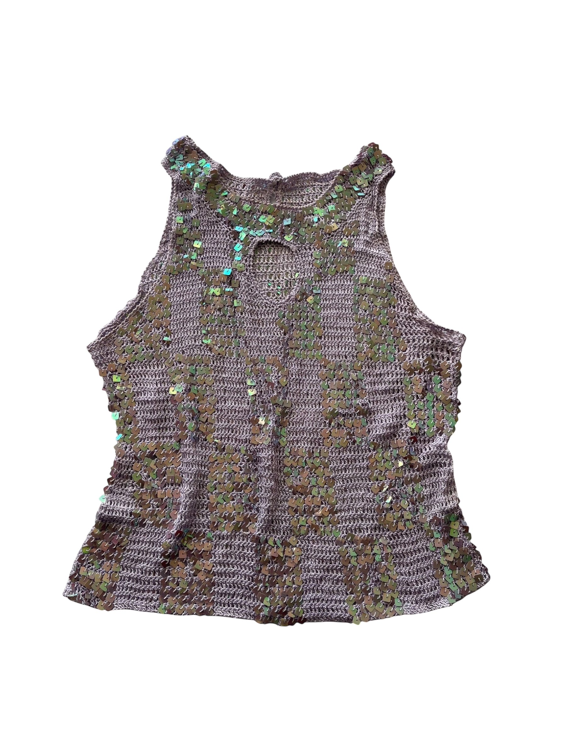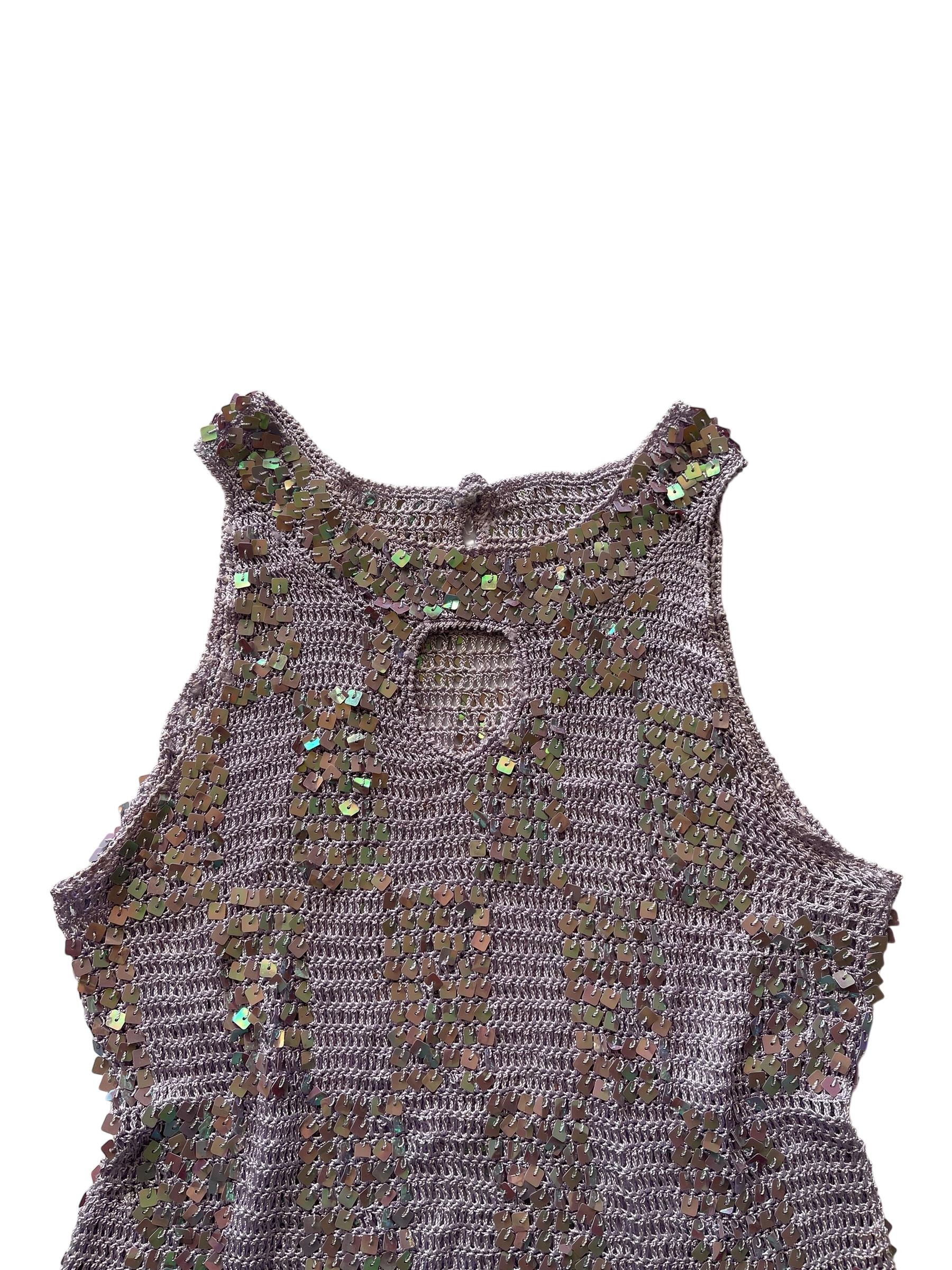 Iridescent purple mesh tank covered in reflective sequins that shimmer under light. Slight stretch with a flattering cropped fit and back keyhole closure.