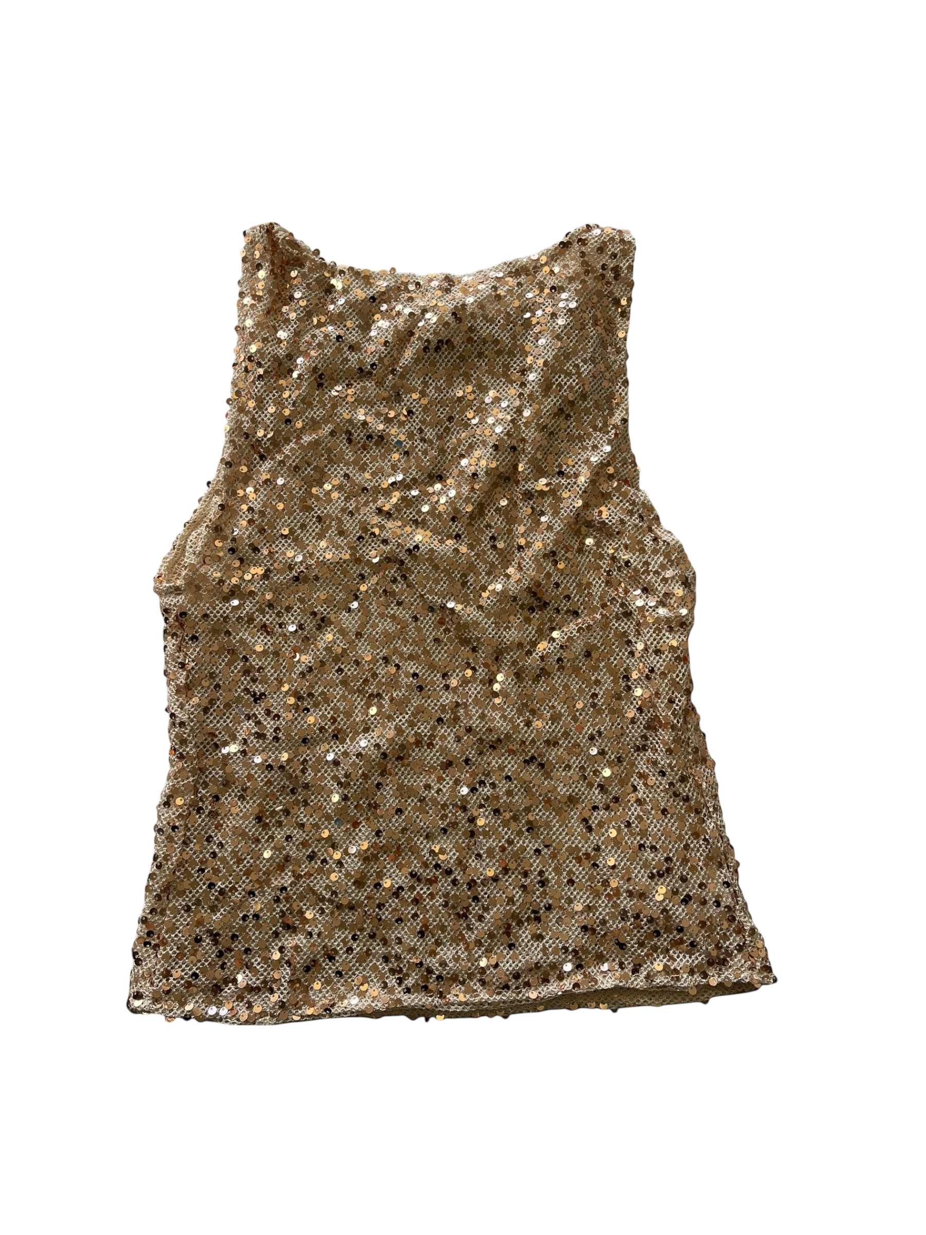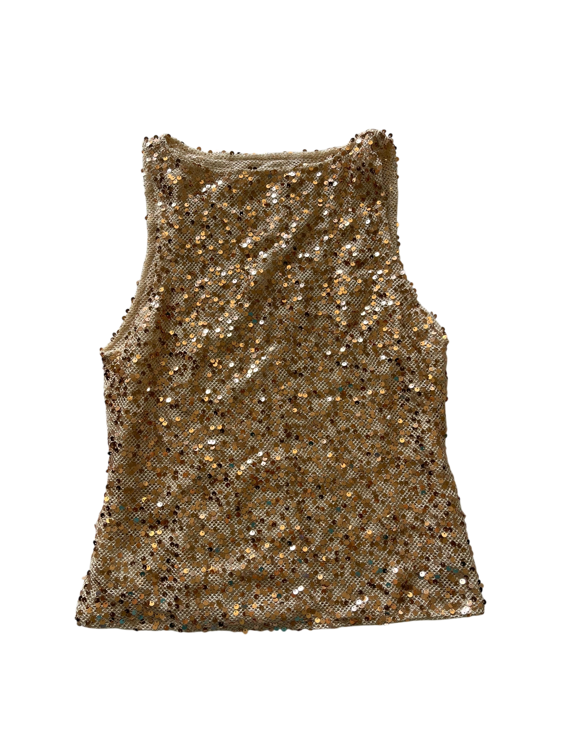 Delicate mesh base fully adorned with champagne-toned sequins that shimmer softly under light. Slight stretch for a comfortable, fitted look.